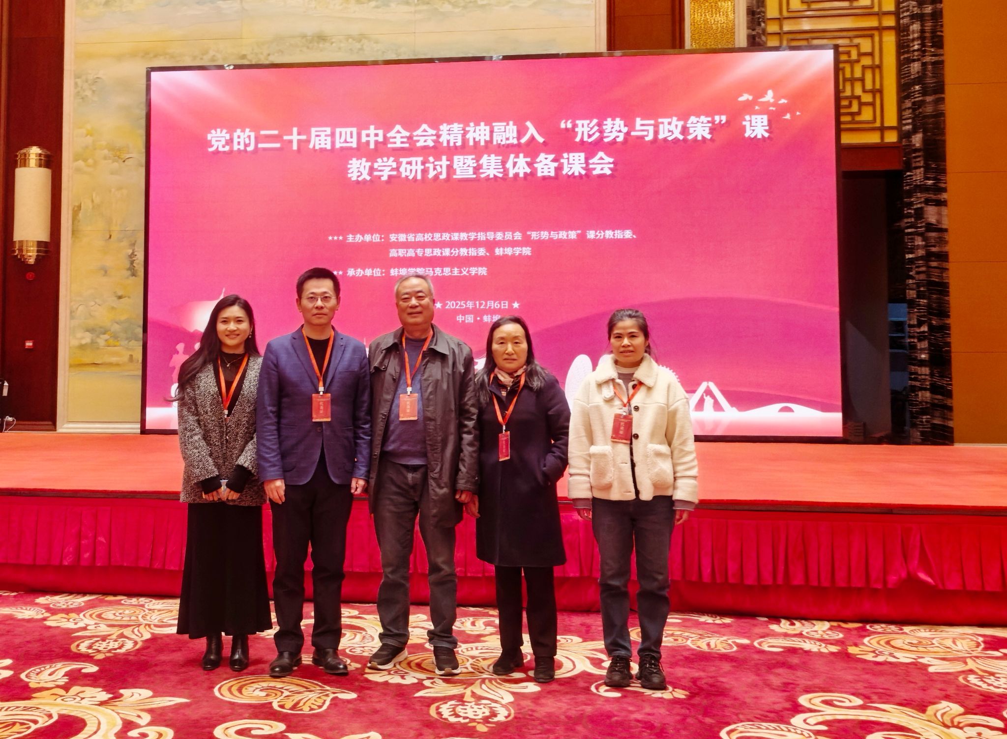 为深入学习贯彻党的二十届四中全会精神,推动“形势与政策”课教学改革创新与高质量发展,12月6日,安徽省高校思政课教学指导委员会“形势与政策”课分教指委、高职高专思政课分教指委、蚌埠学院主办,蚌埠学院马克思主义学院承办的“党的二十届四中全会精神融入‘形势与政策’课教学研讨暨集体备课会”在蚌举办,我校马克思主义学院党总支书记张翮与形势与政策教研室4位教师参加会议。