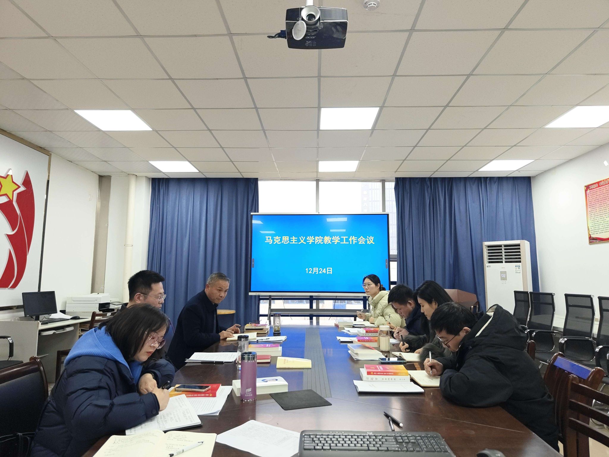 为深入贯彻落实学校教学工作例会精神,进一步推进思政课建设,加强教学管理,强化工作落实,马克思主义学院于12月24日召开教学工作会议。会议由学院副院长黄春主持,学院党总支书记张翮、各教研室负责人参加会议。